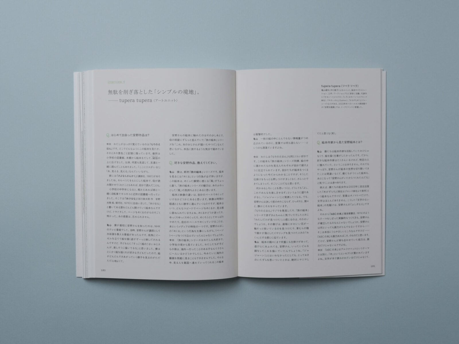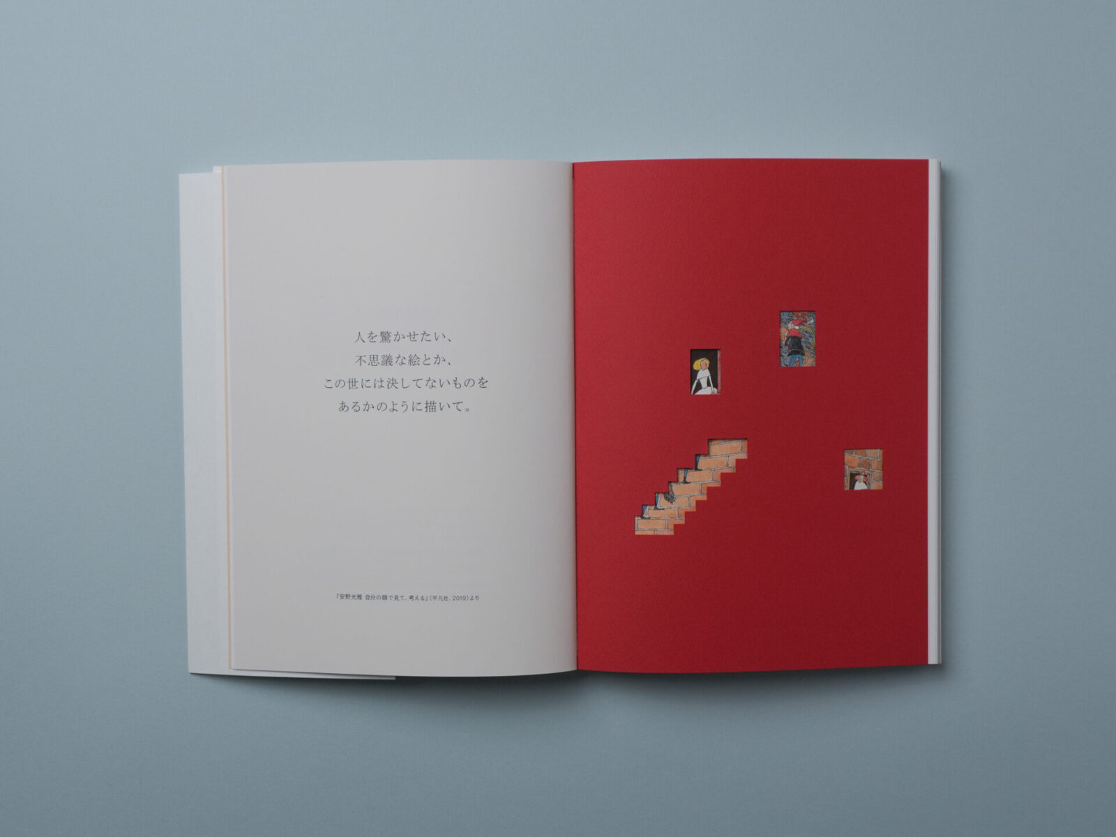 絵本『ふしぎなえ』『旅の絵本』『おおきな ものの すきな おうさま』『天動説の絵本』といった代表作から厳選した原画約130点をはじめ、すべての展示作品とその解説を収録。巻末には「先生へ」と題し、安野作品を愛する6組のクリエイターにインタビューした模様を掲載しました。