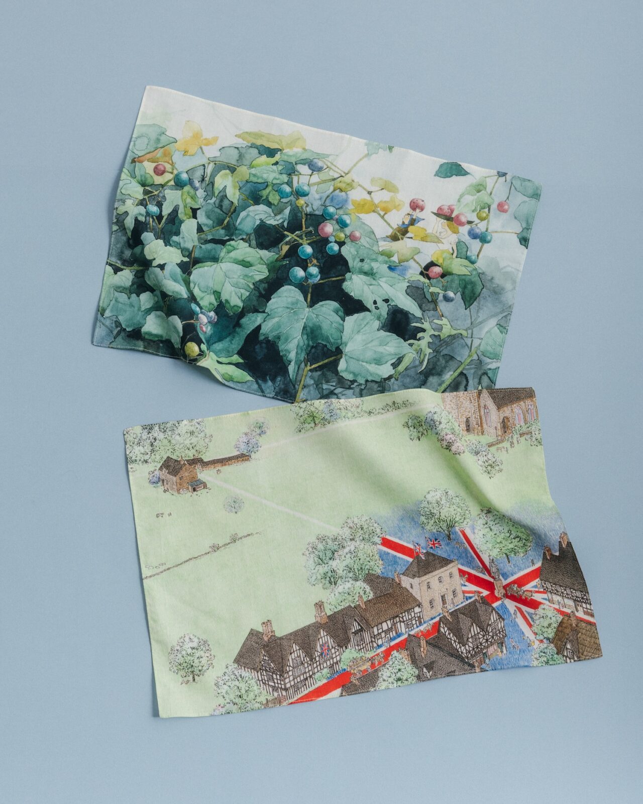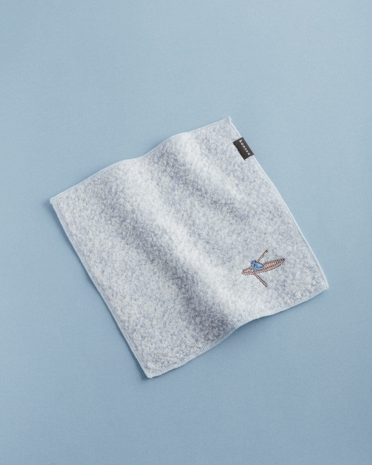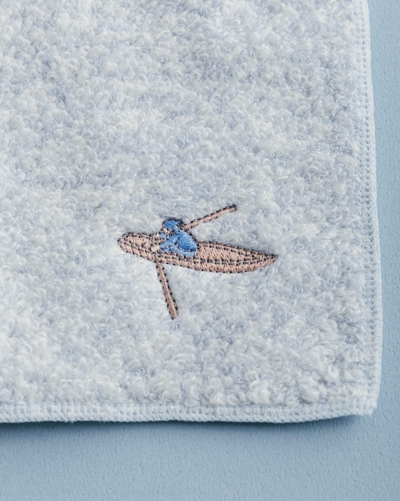 今治タオルに、『旅の絵本 III』〈イギリス編〉に登場する旅人を刺繍であしらったハンドタオル。青の杢調タオルを海に見立て、絵本の一ページ目をそのままハンカチに閉じ込めたような、物語のはじまりを感じる一枚です。