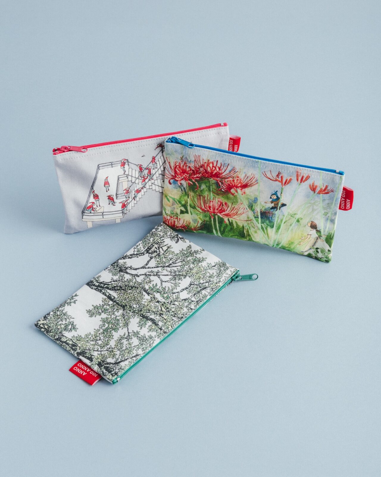 『もりのえほん』『ふしぎなえ』『野の花と小人たち』に登場する「ひがんばな」の絵を大胆にあしらったポーチ。化粧ポーチやペンケースなど、使い勝手のいいサイズ感です。
