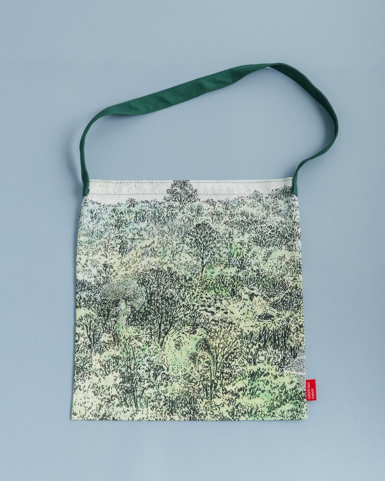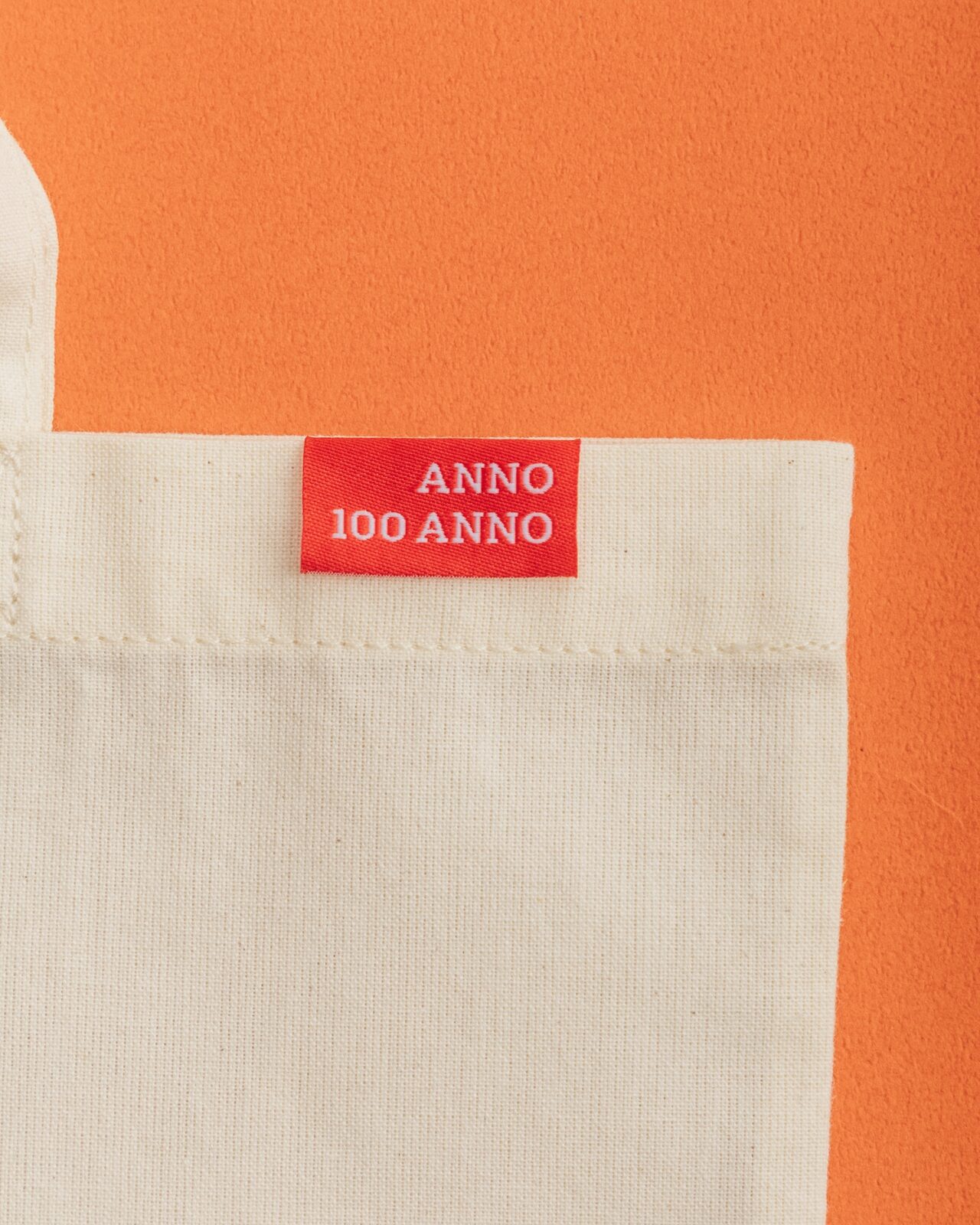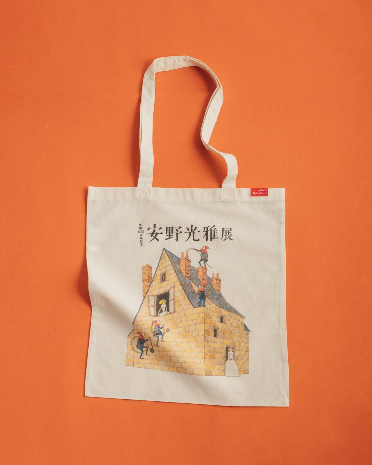 100周年をお祝いして、「生誕100周年記念」のキービジュアルを大きくプリントしたフラットトートバッグ。ANNO 100 ANNOの赤タグがポイント。