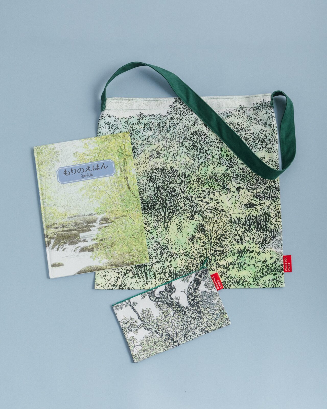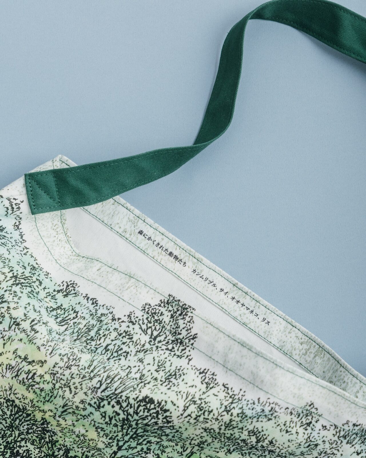 『もりのえほん』のトートバッグ。森の中には、よく目を凝らすと、動物たちの姿が。答えはバッグの内側に。ショルダーバッグとしても使える優れもの。