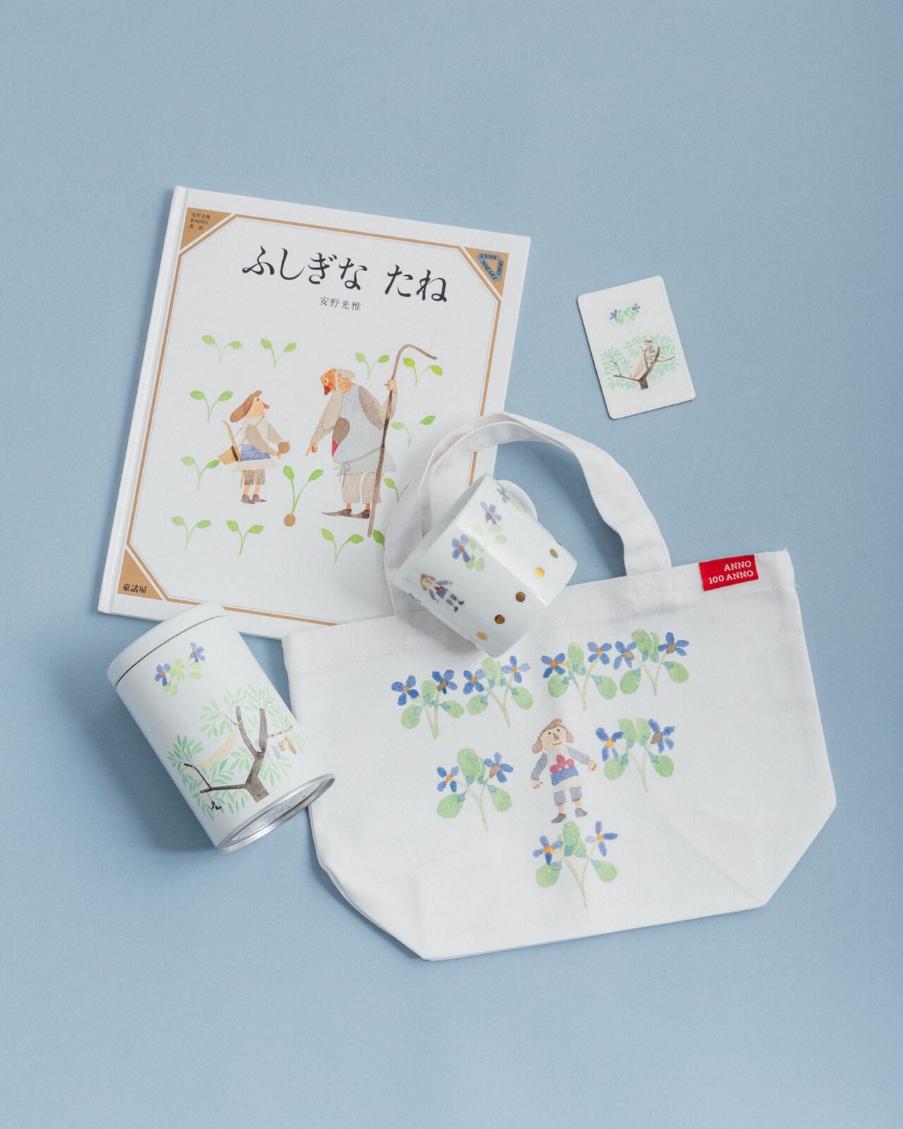 『ふしぎな さーかす』『ふしぎなえ』『旅の絵本 III』〈イギリス編〉『野の花と小人たち』に登場する「のぶどう」の絵をあしらった横長ハンカチ。絵本のページをそのまま大胆にあしらいました。『ふしぎな さーかす』のグッズは、横長ハンカチとポストカードのみです。