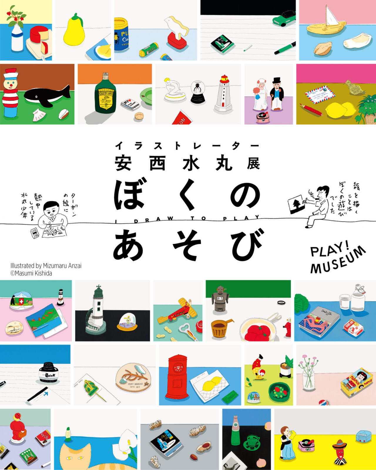 本展は2016年から各地を巡回し話題を集めた「イラストレーター 安西水丸展」に新たな展示を加え、PLAY! MUSEUMから再始動する展覧会です。生前、安西は自身のことを「今でも小学生の絵を描いている、普通の人」とあらわし、「仕事」と「あそび」を行き来しながら制作を続けました。PLAY! ではその仕事のスタイルに着目し、会場では、安西にとって描くことの原点だった「あそび」の感覚をたどりながら、彼の「全仕事」を印刷物、原画、版画、関連資料約400点以上で紹介。そして本展でもPLAY! MUSEUMの楕円型の展示室では、約50mの壁に沿って、画面を横切る一本線が特徴の「ホリゾン作品」約70点を一挙に展示します。安西のイラストレーションと、彼の原風景「房総半島・千倉の海」の水平線がひと続きに繋がったPLAY! ならではの空間演出も見どころです。