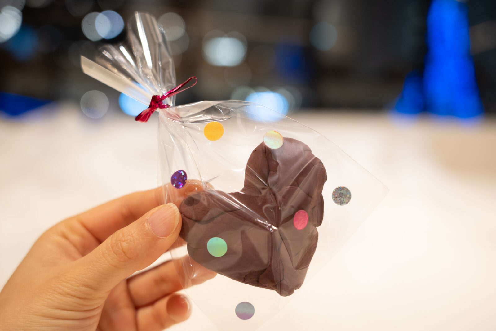 茶色の粘土を袋の上からこねて、ハートや星など好きなチョコレートをつくります。キラキラのシールでラッピングして完成。プレゼントにもそのまま飾っても可愛い!