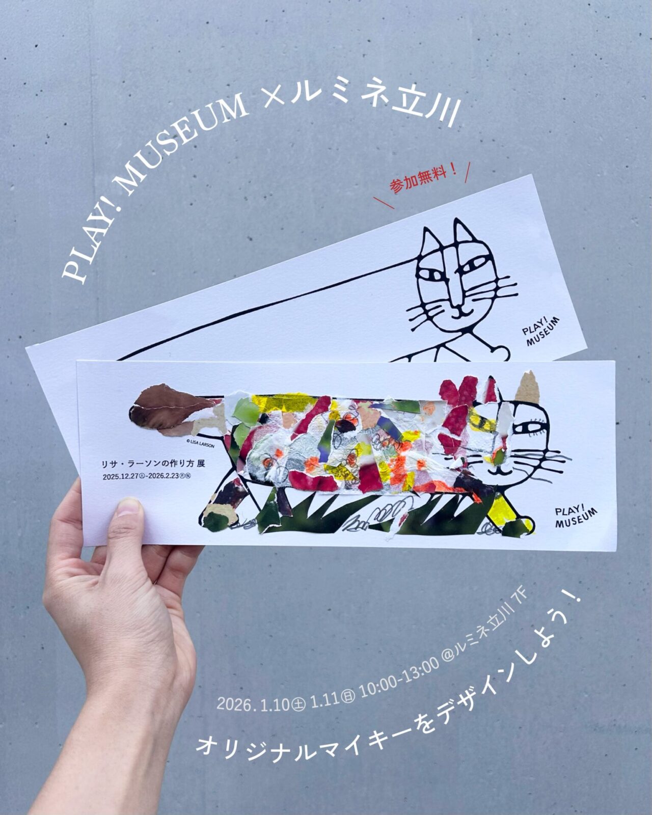 「リサ・ラーソンの作り⽅ 展」の会場で体験できるワークショップが、ルミネ⽴川店バージョンで出張開催します!エシカルなコラージュ素材を切り貼りして、猫のキャラクター「マイキー」にオリジナルの模様をつけてみましょう。完成したオリジナル・マイキーはルミネ⽴川店に展⽰、もしくはお持ち帰りもできます。