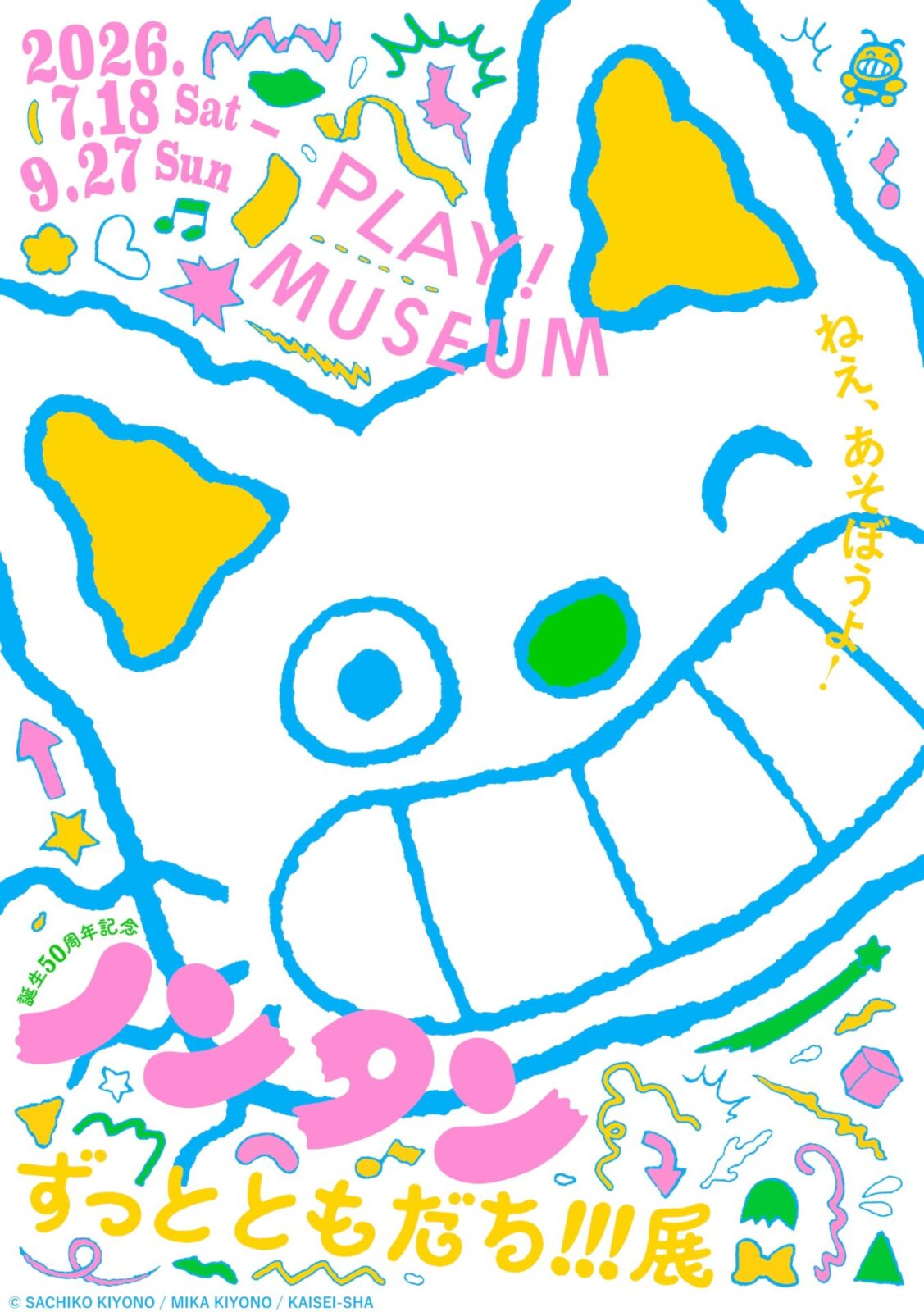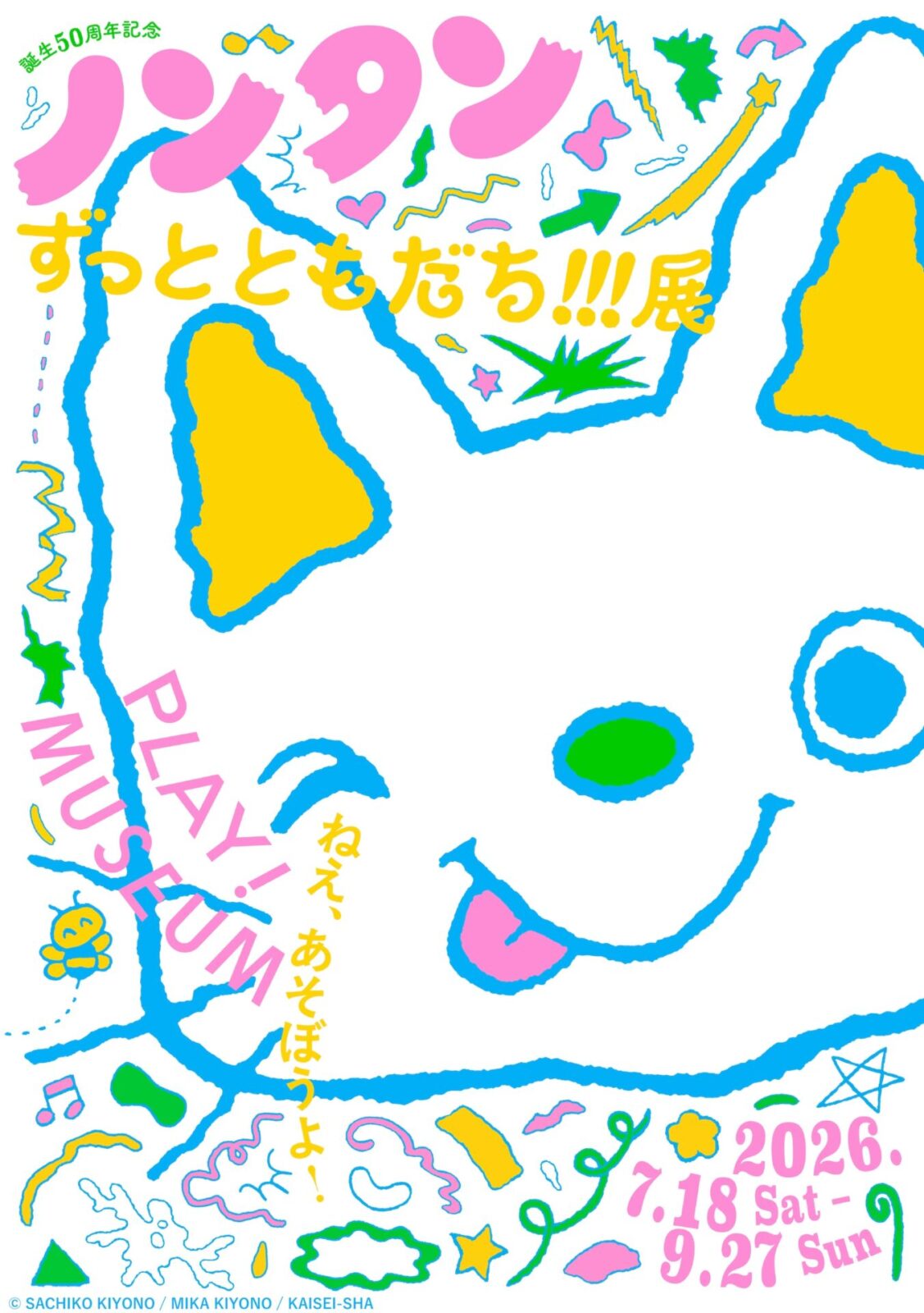 そんなノンタン50回目の誕生日を記念して、絵本の世界から立ちあがる遊びをてんこ盛りに用意した、体験型の展覧会を開催します。 “ノンタン「の」夢の中、ノンタン「を」お祝いする、ノンタン「と」遊ぶ”。「の」「を」「と」の3つのキーワードからなるオリジナルストーリーをたどりながら、前向きで優しさに満ちたノンタンワールドを、映像作品や立体造作を通して全身で味わうことができます。いたずら好きの小さな白ねこと、子どもも大人も手をつなげば、この先もずーーーっとともだちです。こうした体験型の展示に加えて、色鮮やかなノンタンの絵本原画約50点やスケッチも楽しめます。