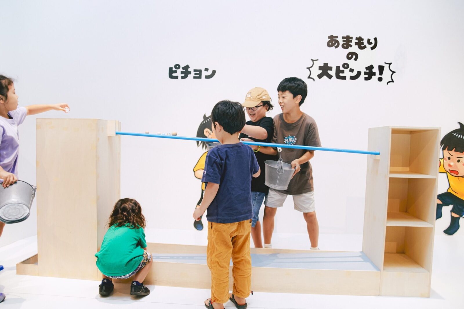 会場で鈴木さんがまず紹介してくれたのは、「あまもりの大ピンチ」。雨水に見立てた玉を、ひとりが箱と箱の間に架けられた2本の棒に転がし、もうひとりがバケツで受け止めるという遊びです。それぞれの展示には、絵本でもおなじみの「大ピンチレベル」が表示されており、これは「61」です。