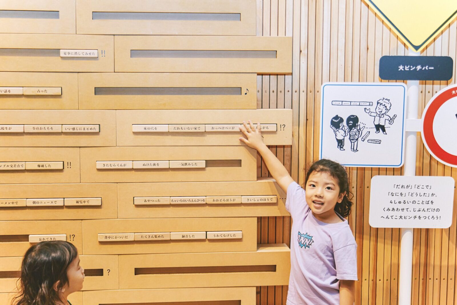 さらに進むと、ドアノブに触れようとすると「入ってま〜す」などと不思議な声がする「トイレの大ピンチ」、犬のフンそっくりの物体が転がる「フンの大ピンチ」、フォトスポットとして大人気の「ステーキの大ピンチ」など、会場が盛り上がること間違いなしの遊びが続きます。次に鈴木さんには「かんがえるピンチ」の展示のひとつ「大ピンチバー」について、紹介していただきました。「誰が」「どこで」「何を」「どうした」と書かれたたくさんのバーを、自在に組み合わせる遊びです。
