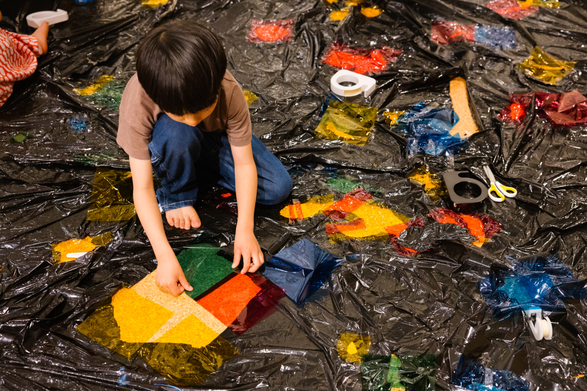 とても大きなビニールに好きな形の穴を開けて、カラーセロハンを切り貼りすれば、オリジナルの空の完成です。宙に浮かべた空の下に入って、カラフルな色の世界を楽しもう!