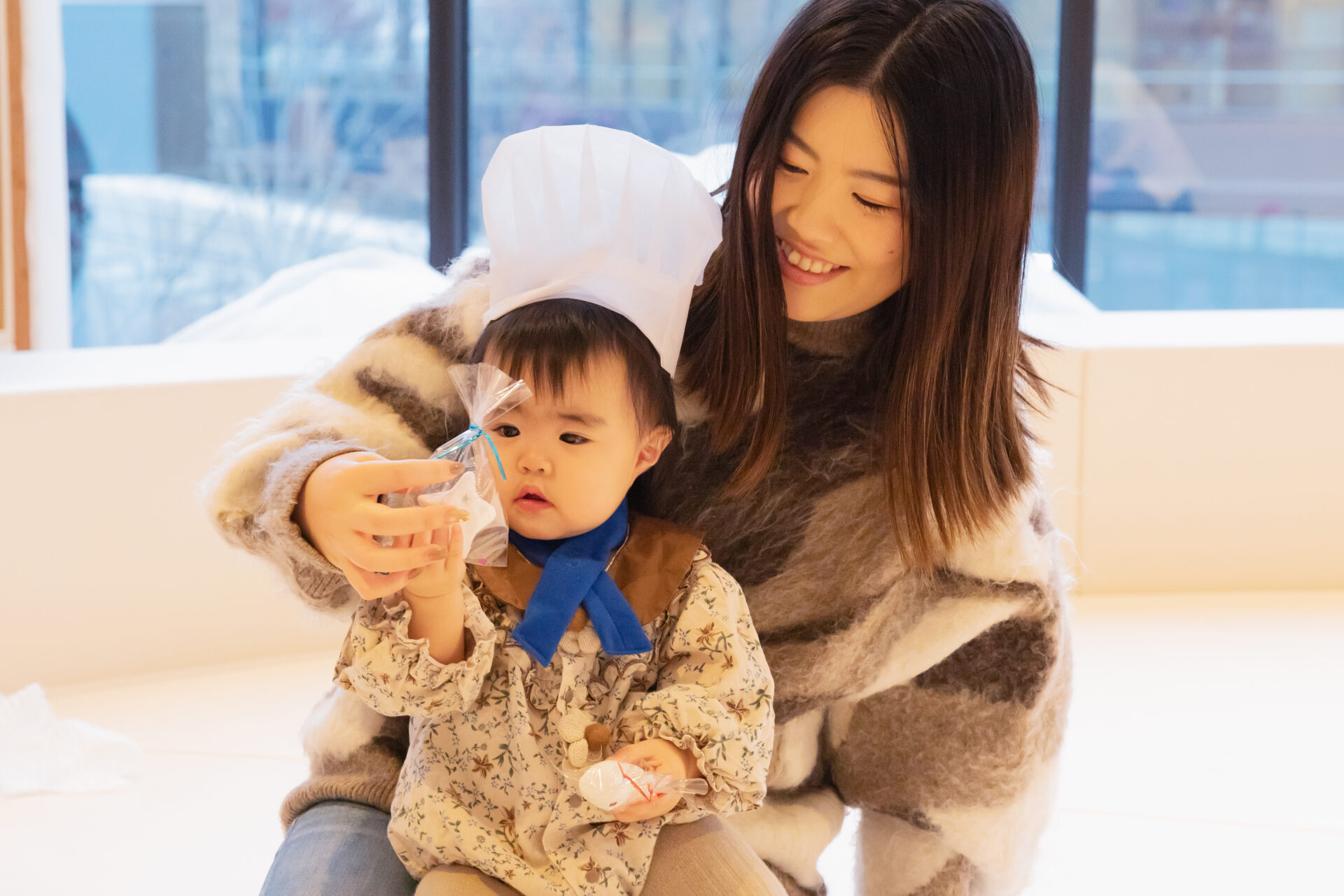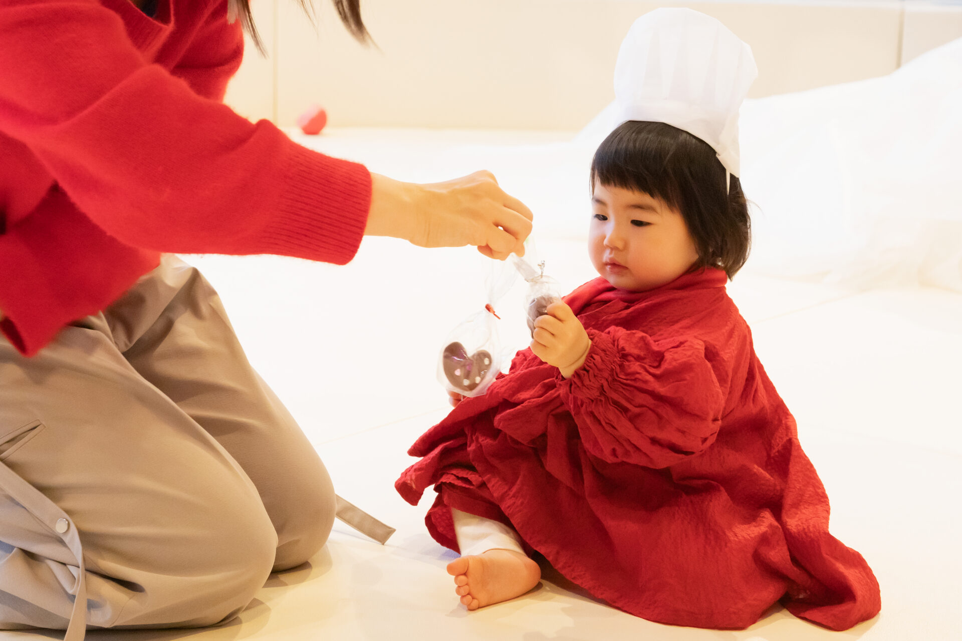 コック帽と赤いスカーフを身につけ、パティシエに変身!茶色の粘土を袋の上からこねて、ハートや星など好きなチョコレートをつくります。
