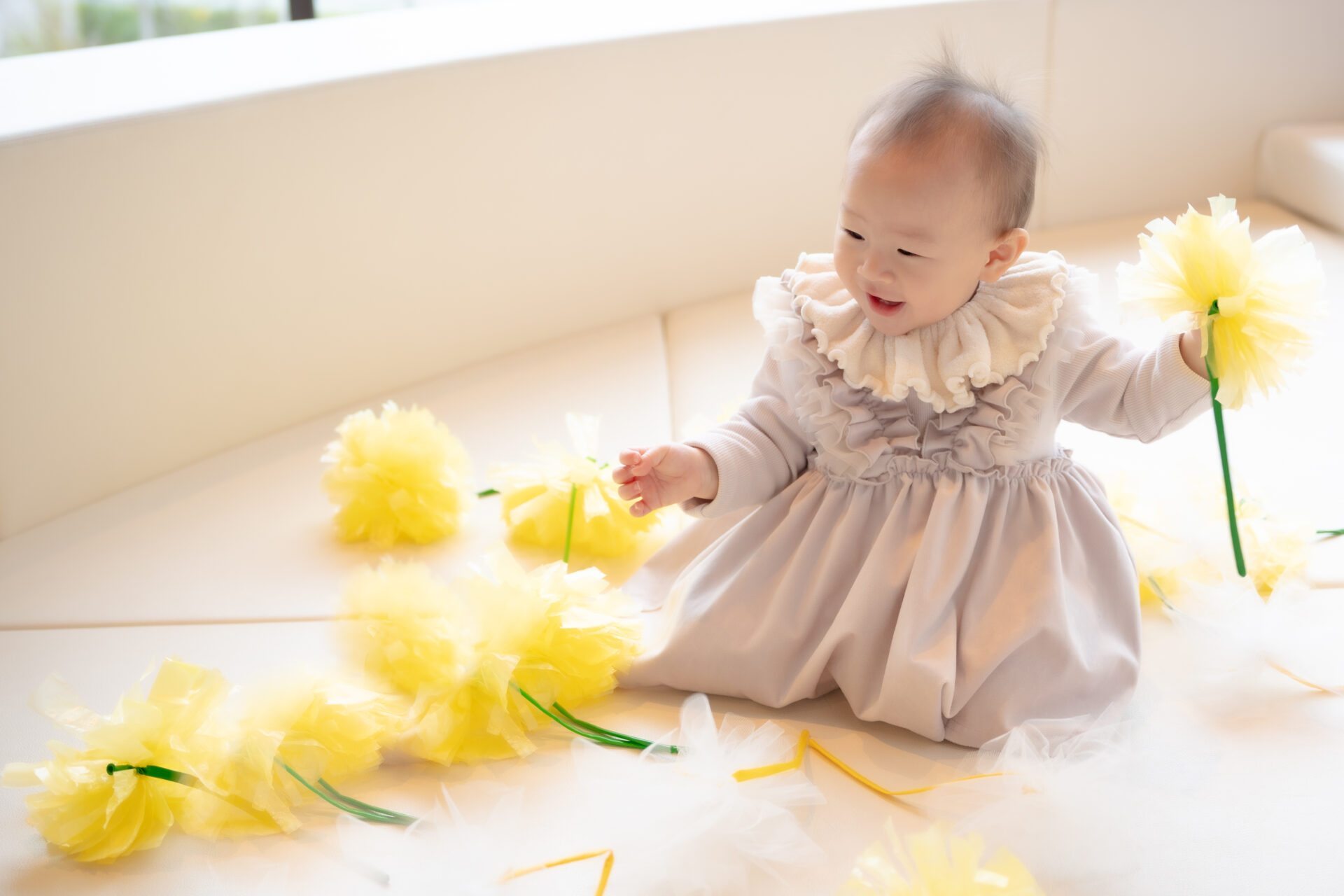 黄色い平テープでできたたんぽぽと柔らかいチュールでできた綿毛が一面に広がります。カサカサ、ふわふわ、ビューン…埋もれたり目で追いかけたり感触あそびを楽しもう!