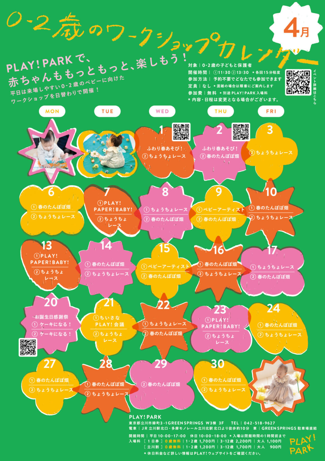 | 参加費 | 無料(別途PLAY! PARK入場料) *1歳未満入場無料(母子手帳や保険証など、子どもの年齢を確認できる書類を受付でご提示ください) |