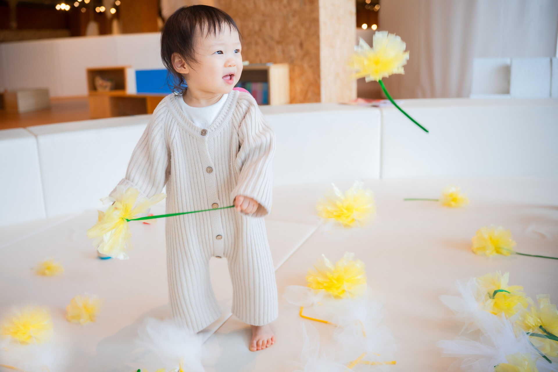 一面に広がる、黄色い平テープでできたたんぽぽ。空からは、ふわふわのチュール素材の綿毛が空間に舞います。茎部分にはゴム風船をつけているので飛ばして遊ぶことも!カサカサ、ふわふわ、ビューン…埋もれたり目で追いかけたり感触あそびを楽しもう。
