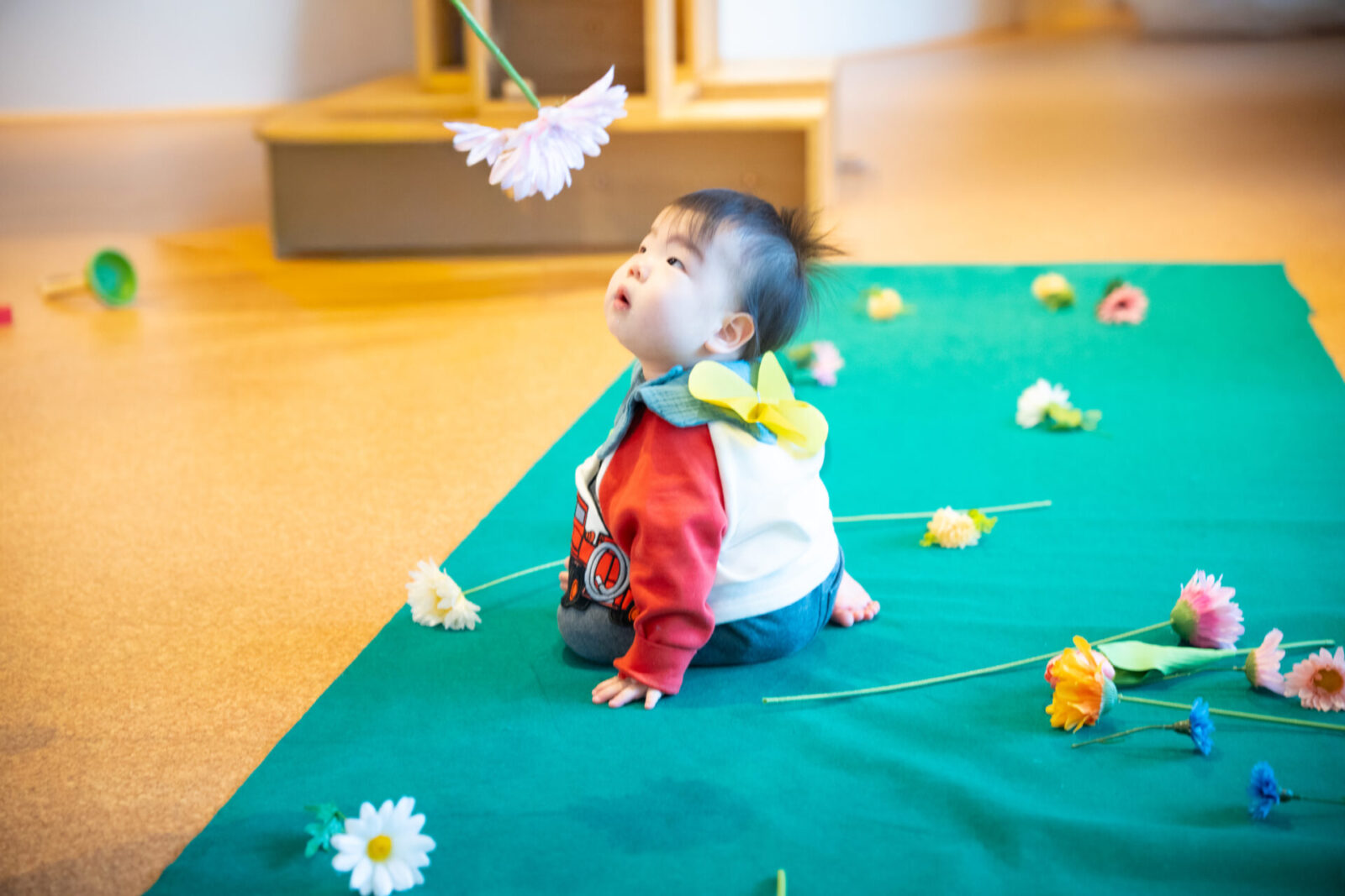 お花が散りばめられた原っぱのような道をハイハイで進み、ゴールを目指そう!