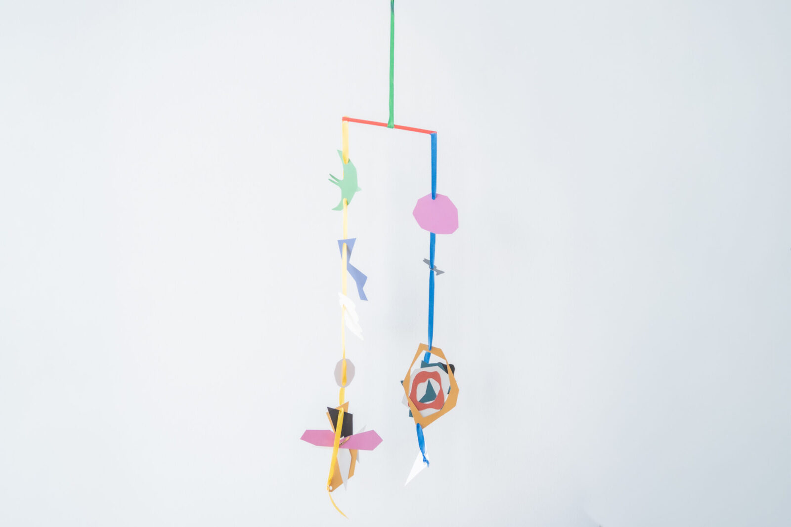 切り抜いて重ねて、ストローとリボンでつなげて、カラフルなモビールをつくろう!